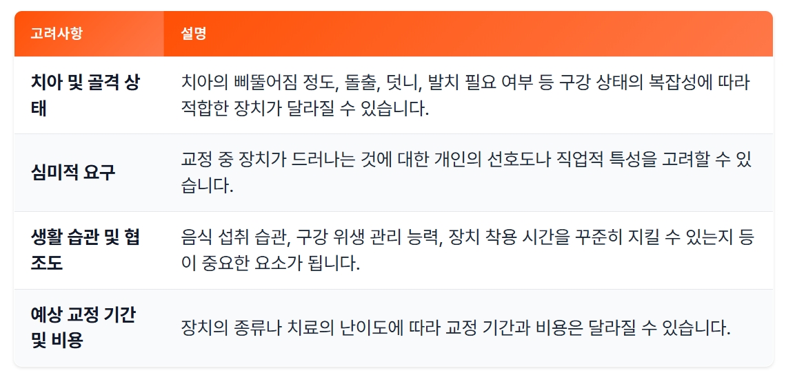 어떤 장치가 더 좋다고 단정하기보다는, 개인의 상황에 맞는 장치를 선택하는 것이 중요합니다. 교정 장치를 선택할 때는 다음과 같은 점들을 종합적으로 고려해야 합니다.